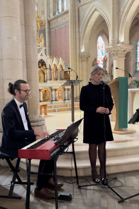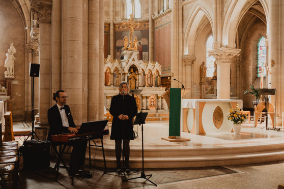 Notre duo chanteuse pianiste a débuté la journée avec l'animation de la messe de mariage, au sein de la majestueuse Église Saint-Pavin, au Mans. Cette église est magnifique, et ce décor était parfait pour célébrer l'engagement de nos mariés, qui avaient choisi des chants parmi notre répertoire de cérémonie pour ponctuer leur messe de moments musicaux de recueillement, de prière et de célébration : Ave Maria de Gounod, Qu'il est formidable d'aimer, Tu seras la louange, l'Alléluia de Taizé pour les chants religieux, mais également quelques morceaux plus récents pour d'autres moments de la cérémonie, comme Love me like you do (Ellie Goulding), Halo (Beyoncé), Marry you (Bruno Mars), Perfect (Ed Sheeran), ou encore une chanson spéciale demandée par les mariés, Ordinary - vous pouvez d'ailleurs en voir un extrait sur notre compte Instagram !