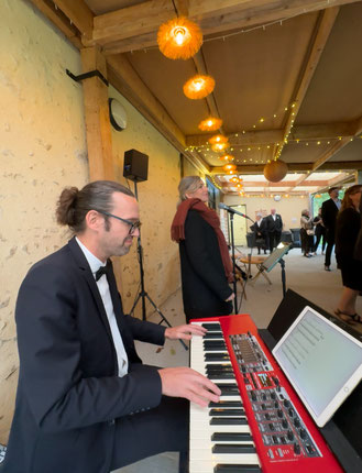 Gîte de la Gandonnière, pour le vin d'honneur, toujours en duo piano-voix. L'ambiance était décontractée mais toujours élégante, ce que nos musiciens essaient de souligner avec leur animation